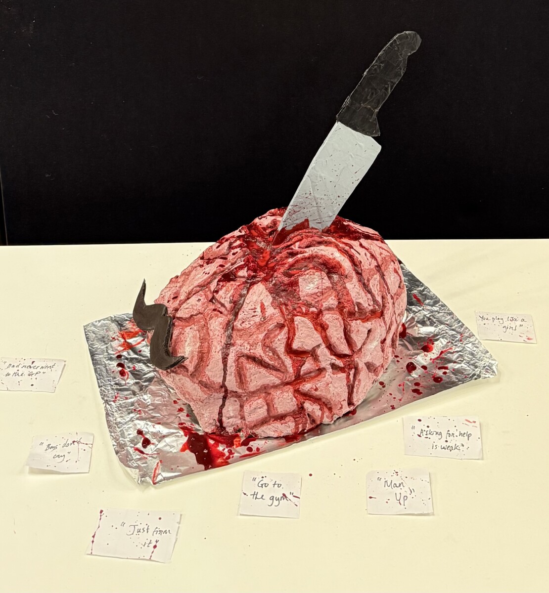 For our sculpture, we created a model of a brain that has been dramatically and obviously injured.