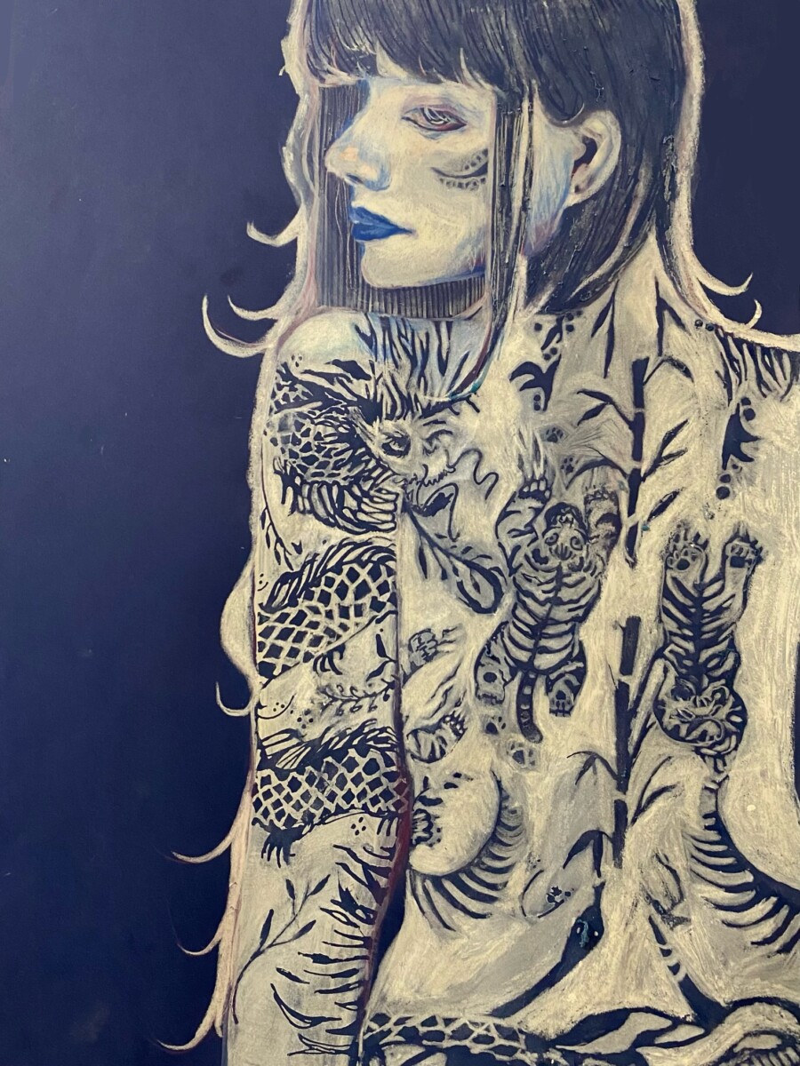 Using a style that mimics fine china patterns, I drew a dragon that wraps around her arm, two tigers, and a python mating ball. The python mating ball— a phenomenon where female python is tightly wrapped around by male pythons for mating, cruelly preventing its escape— symbolises the predatory violence experienced by women in vulnerable conditions.