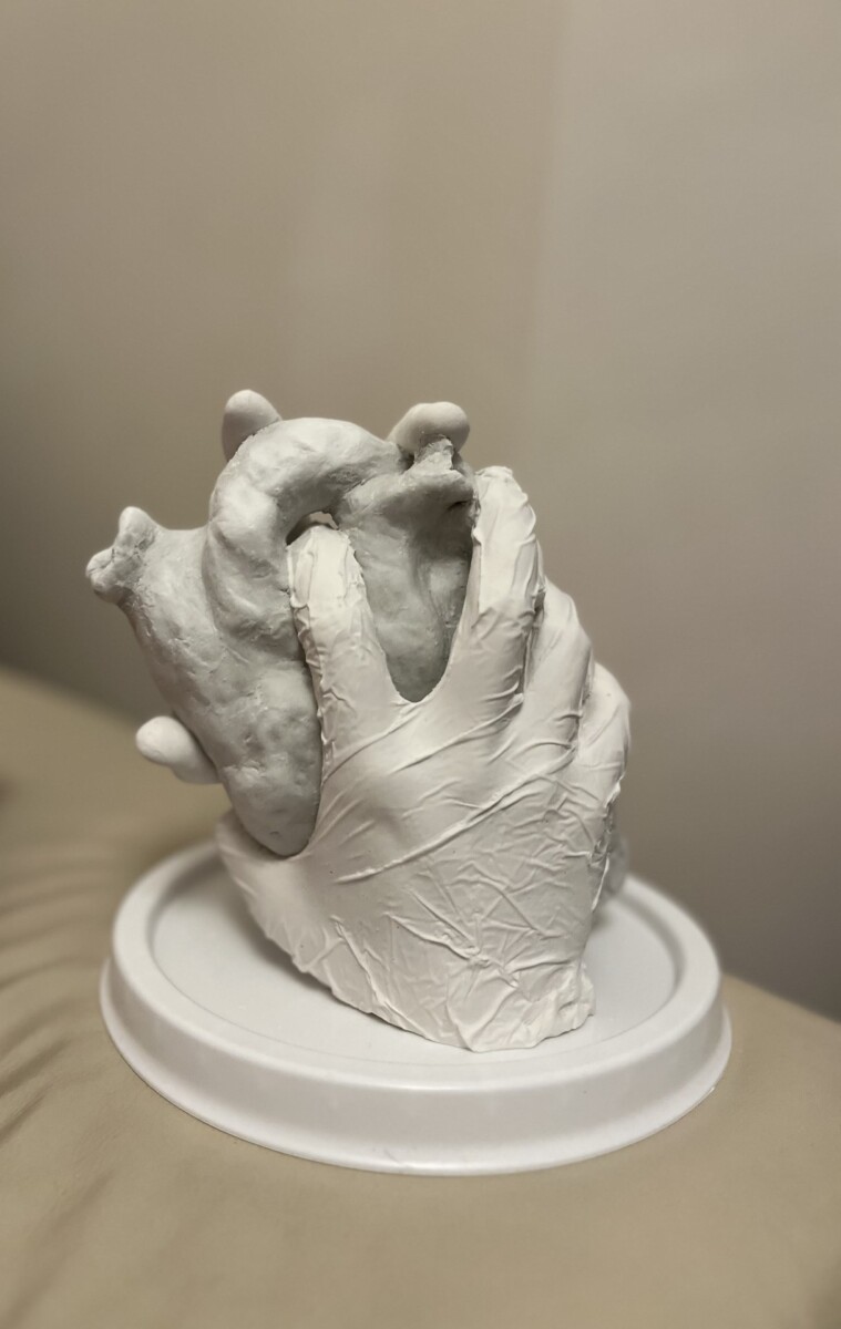 In the process I first crafted the heart by creating a wire skeleton, then filled it with newspaper and sculped over with creative clay. Once the heart was set, I use alginate to create a mould and casting powder to shape the hands in the position while holding the heart. This process took several days to set, cast and refine into the final piece.